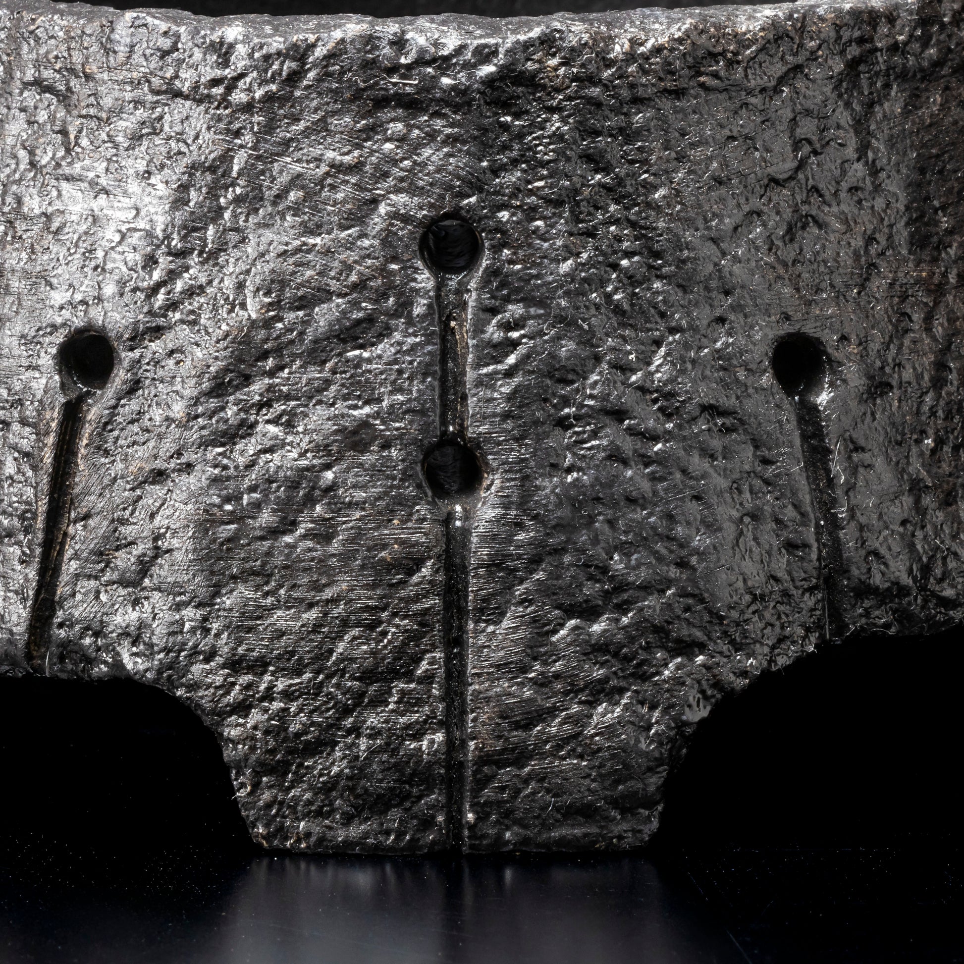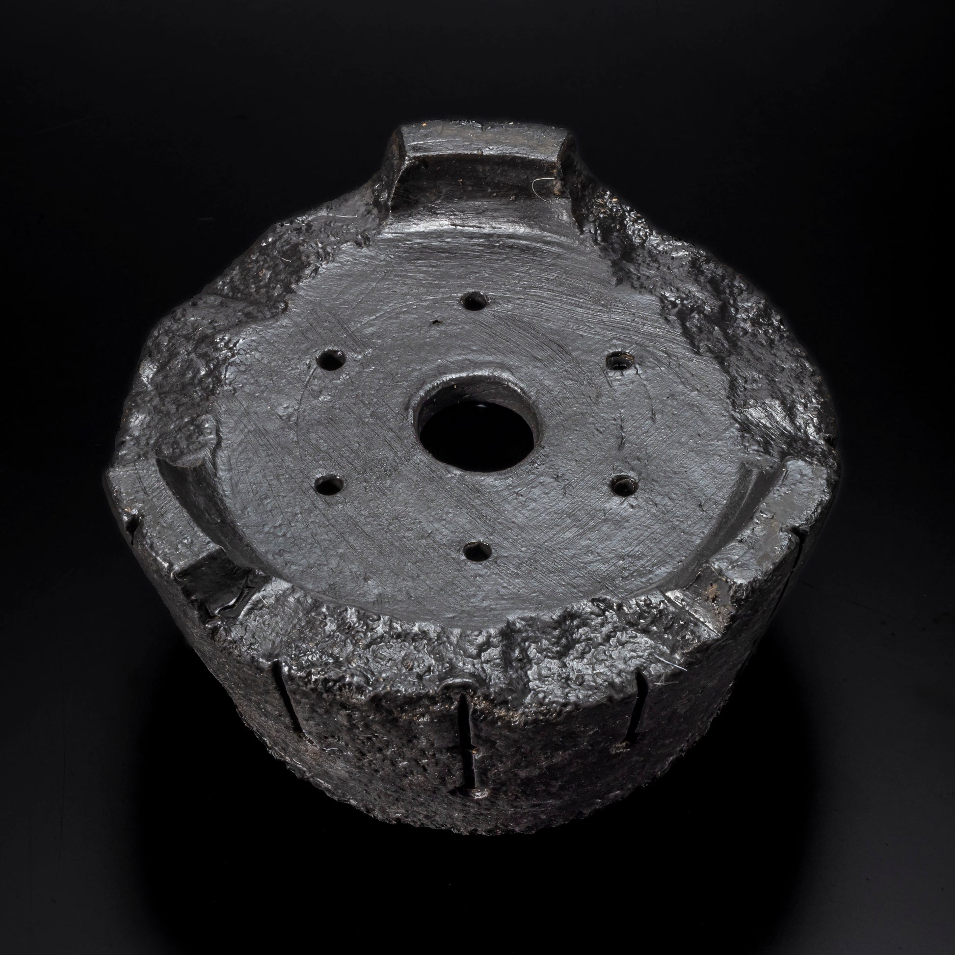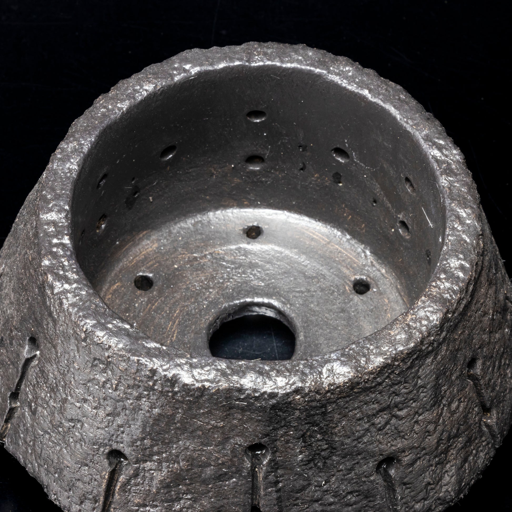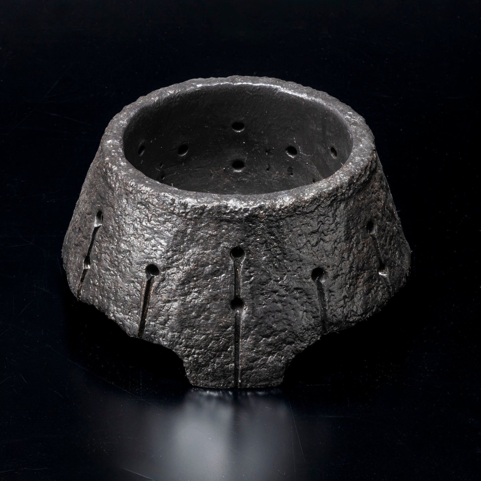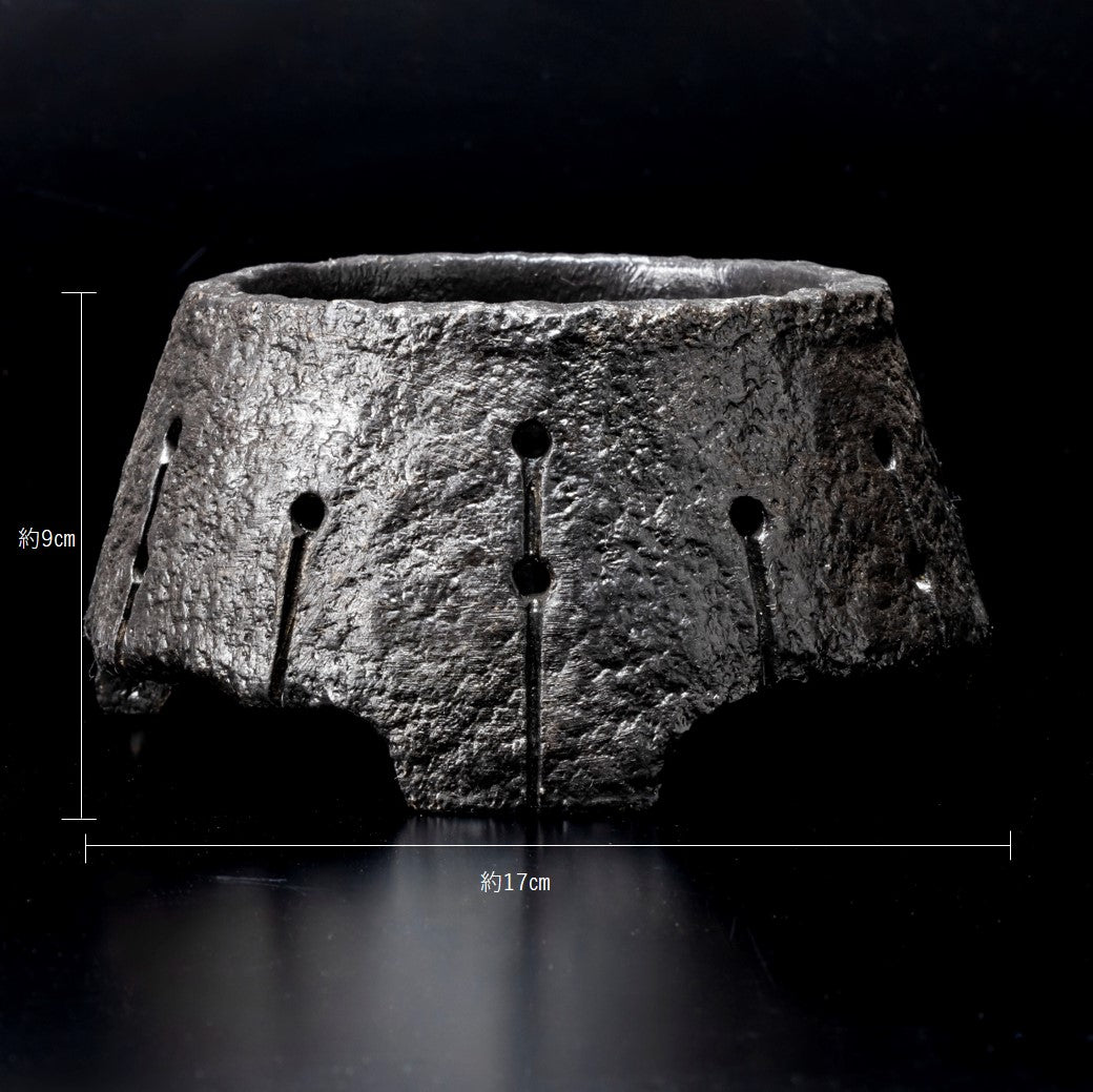 側面に穴をあけ、水みちを通し根腐れのしにくい工夫を施した植木鉢です。表面を御影石の破片で押して割れ肌を表現しています。安定感のある三点の足は角度を変える事で違う表情が楽しめます。国際特許取得済みの作品です。