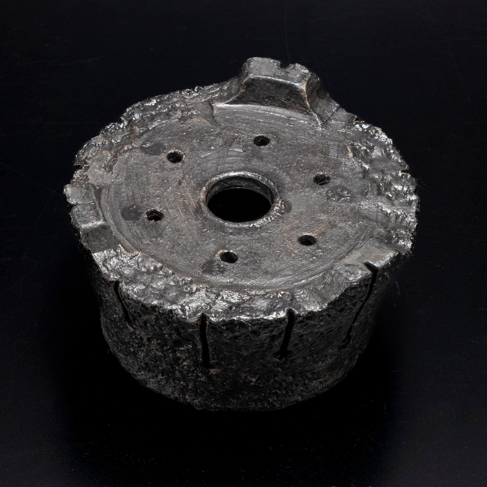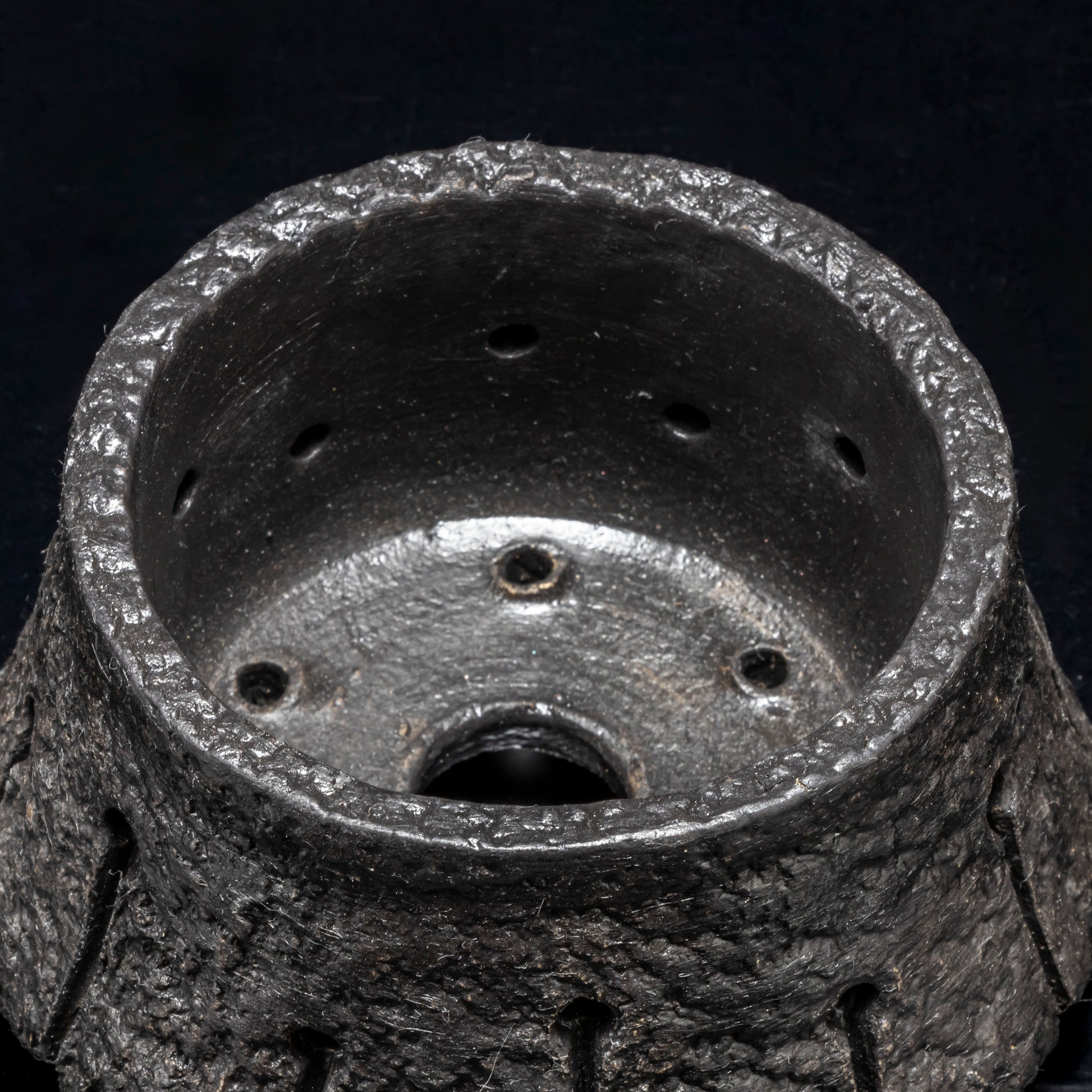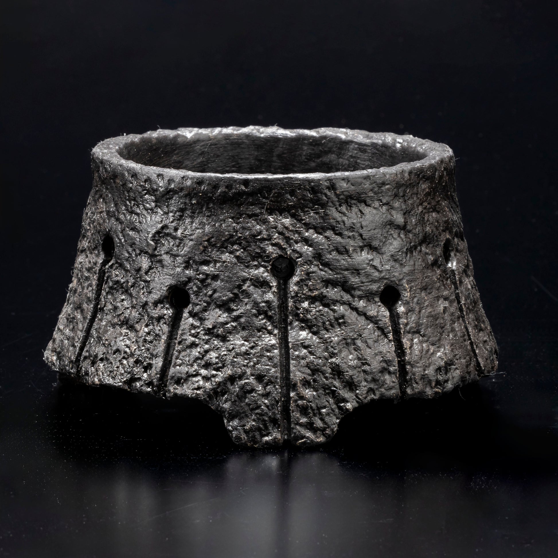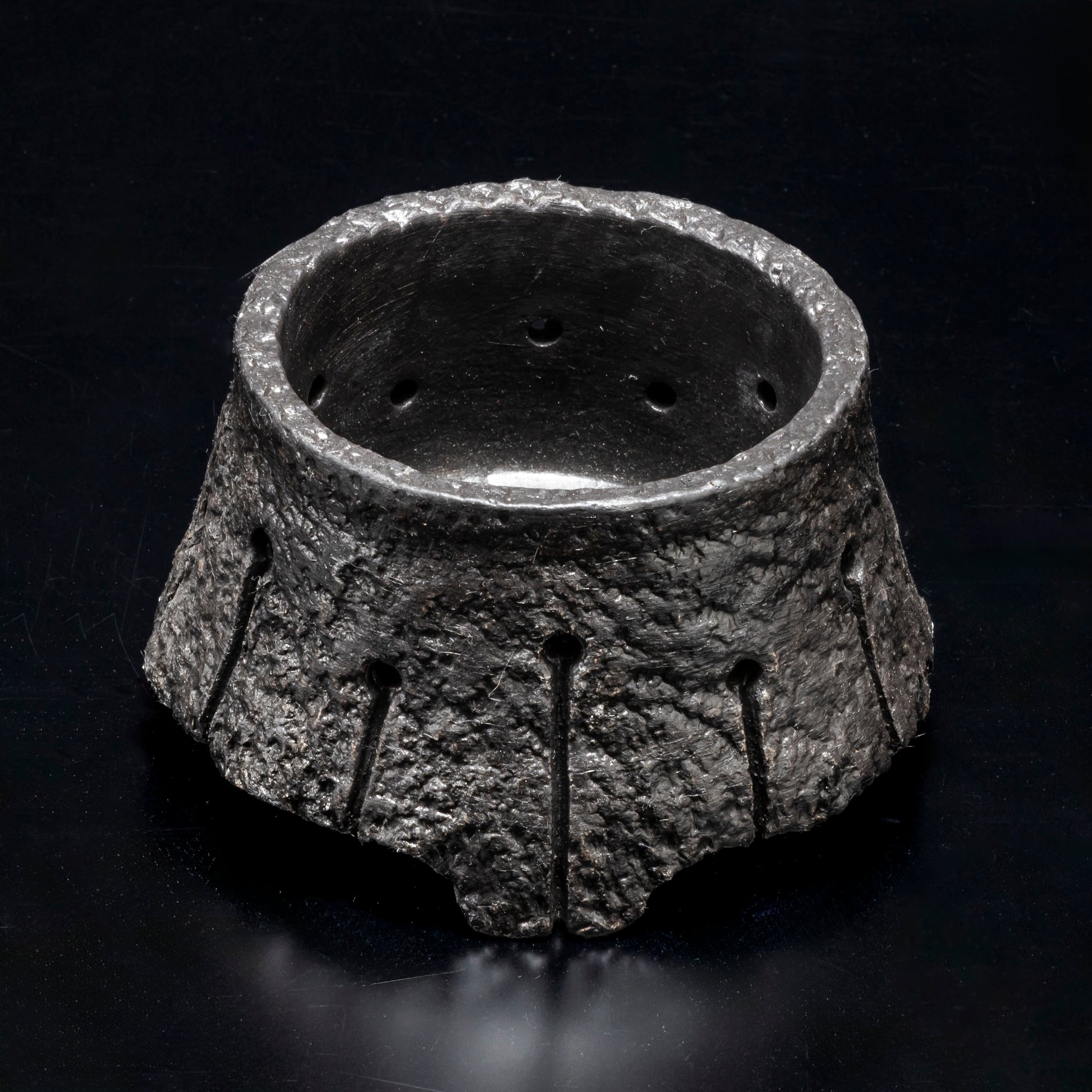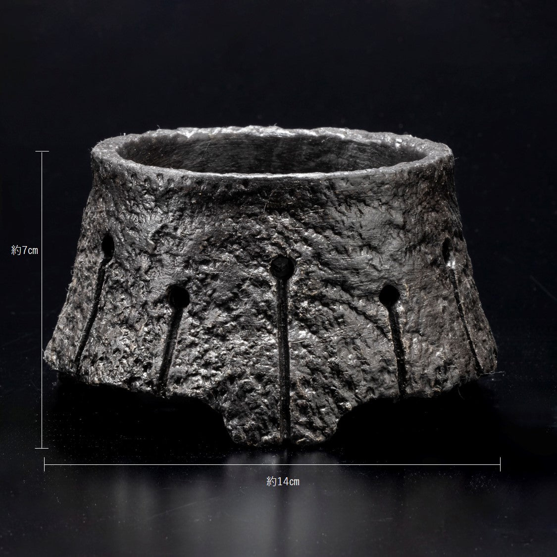 側面に穴をあけ、水みちを通し根腐れのしにくい工夫を施した植木鉢です。表面を御影石の破片で押して割れ肌を表現しています。安定感のある三点の足は角度を変える事で違う表情が楽しめます。国際特許取得済みの作品です。