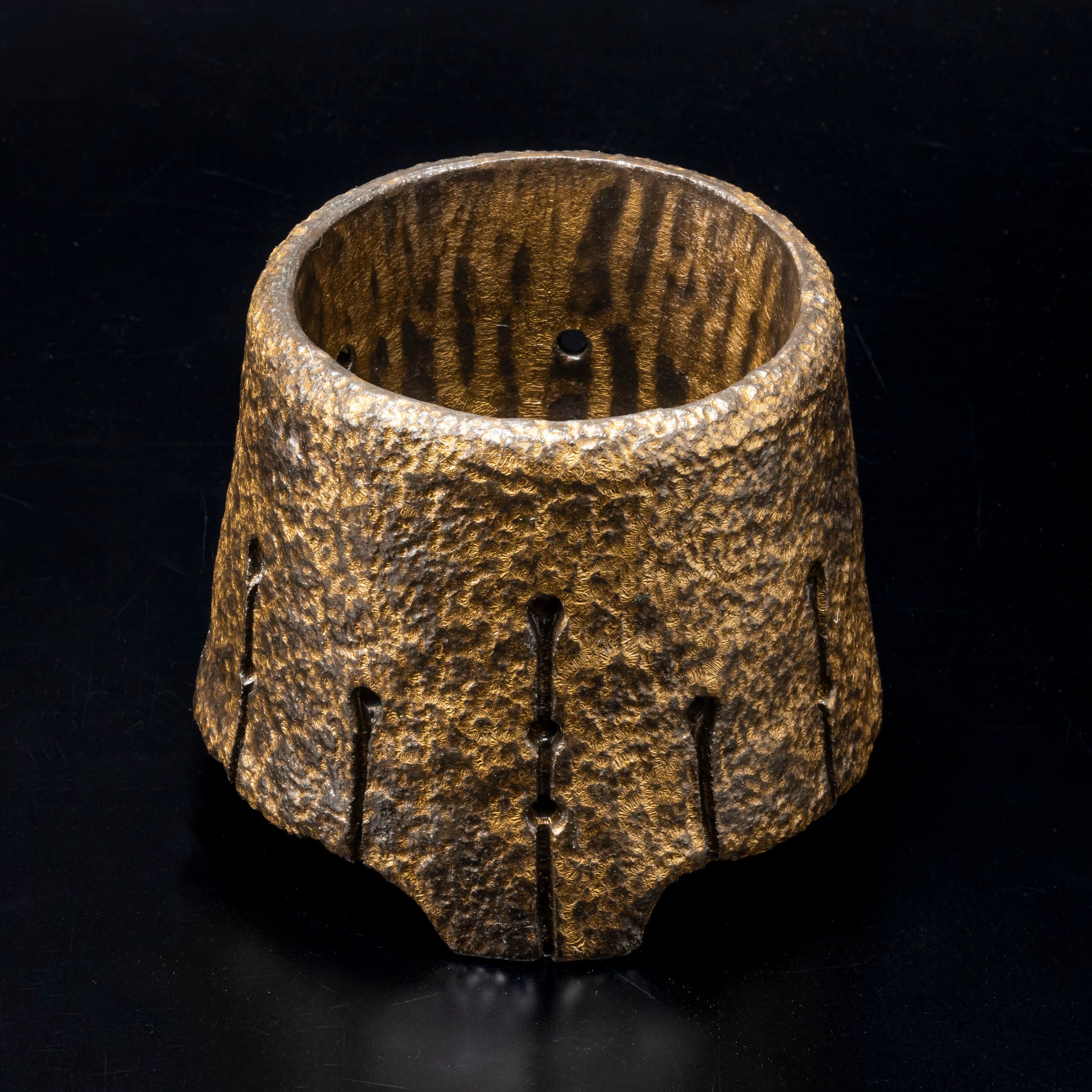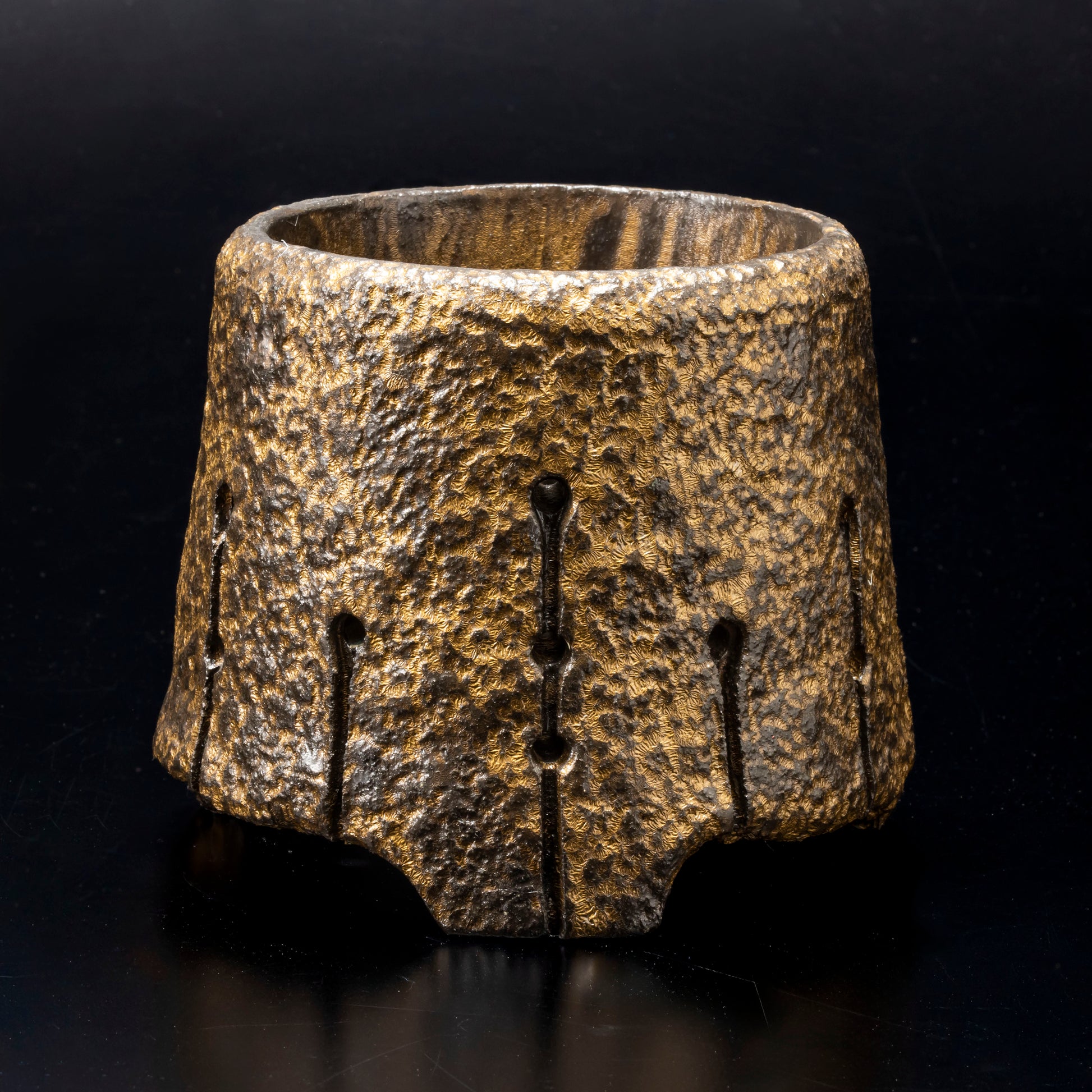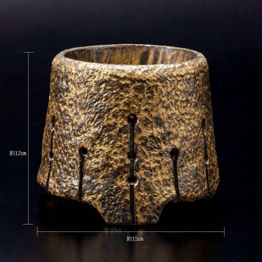 側面に穴をあけ、水みちを通し根腐れのしにくい工夫を施した植木鉢です。表面を御影石の破片で押して割れ肌を表現しています。釉薬を変える事で色味に変化をもたらしています。安定感のある三点の足は角度を変える事で違う表情が楽しめます。国際特許取得済みの作品です。