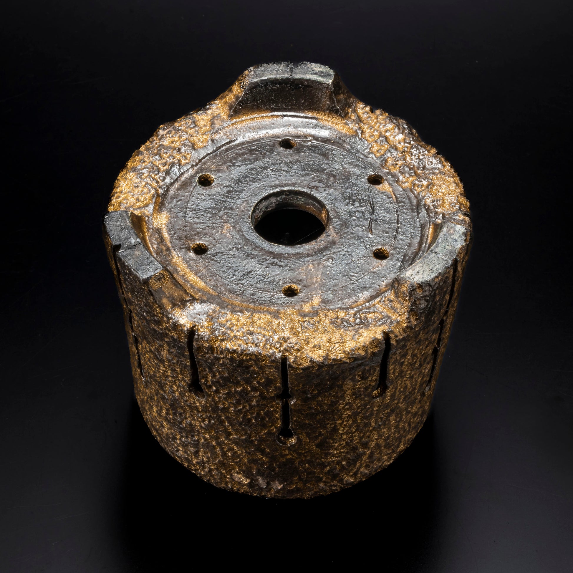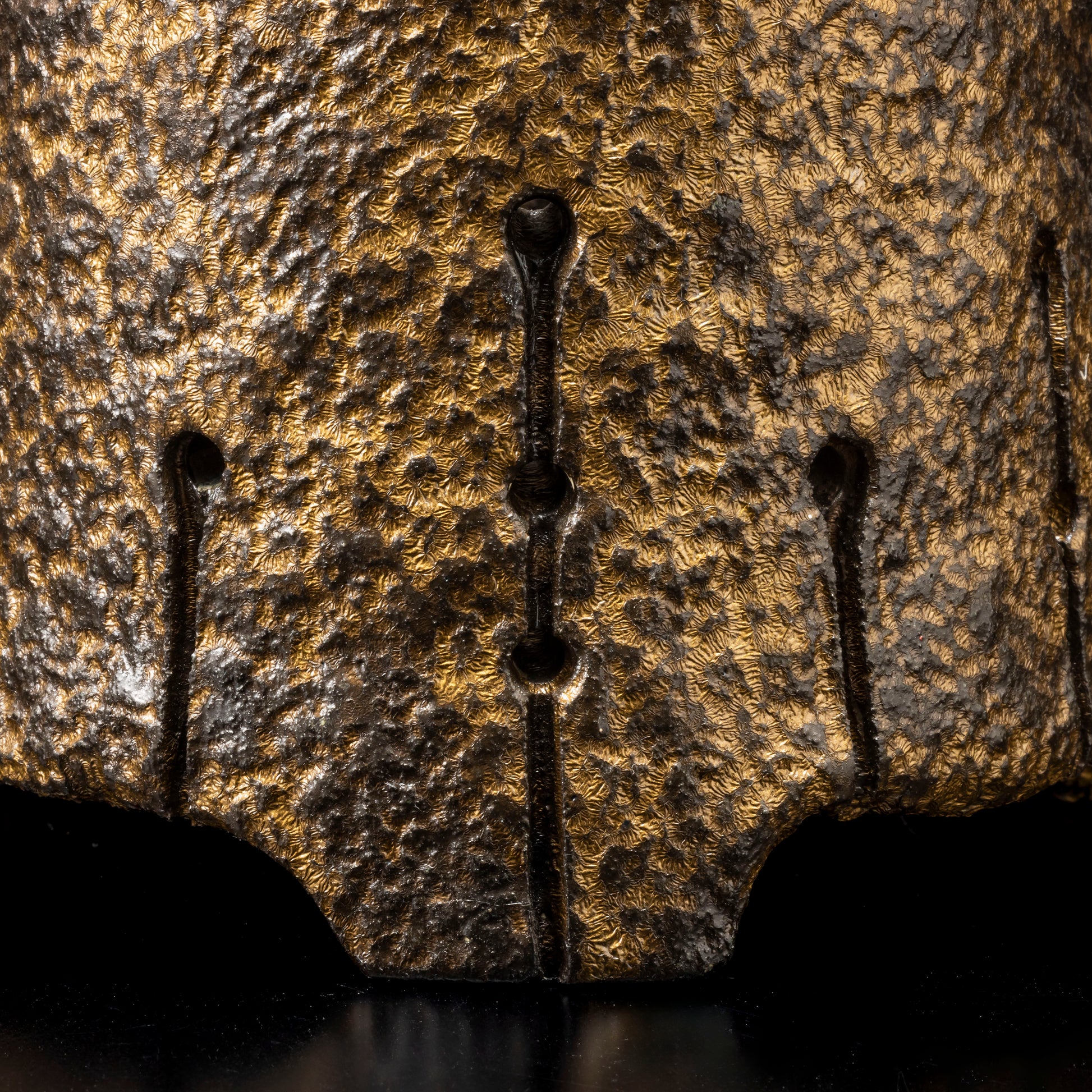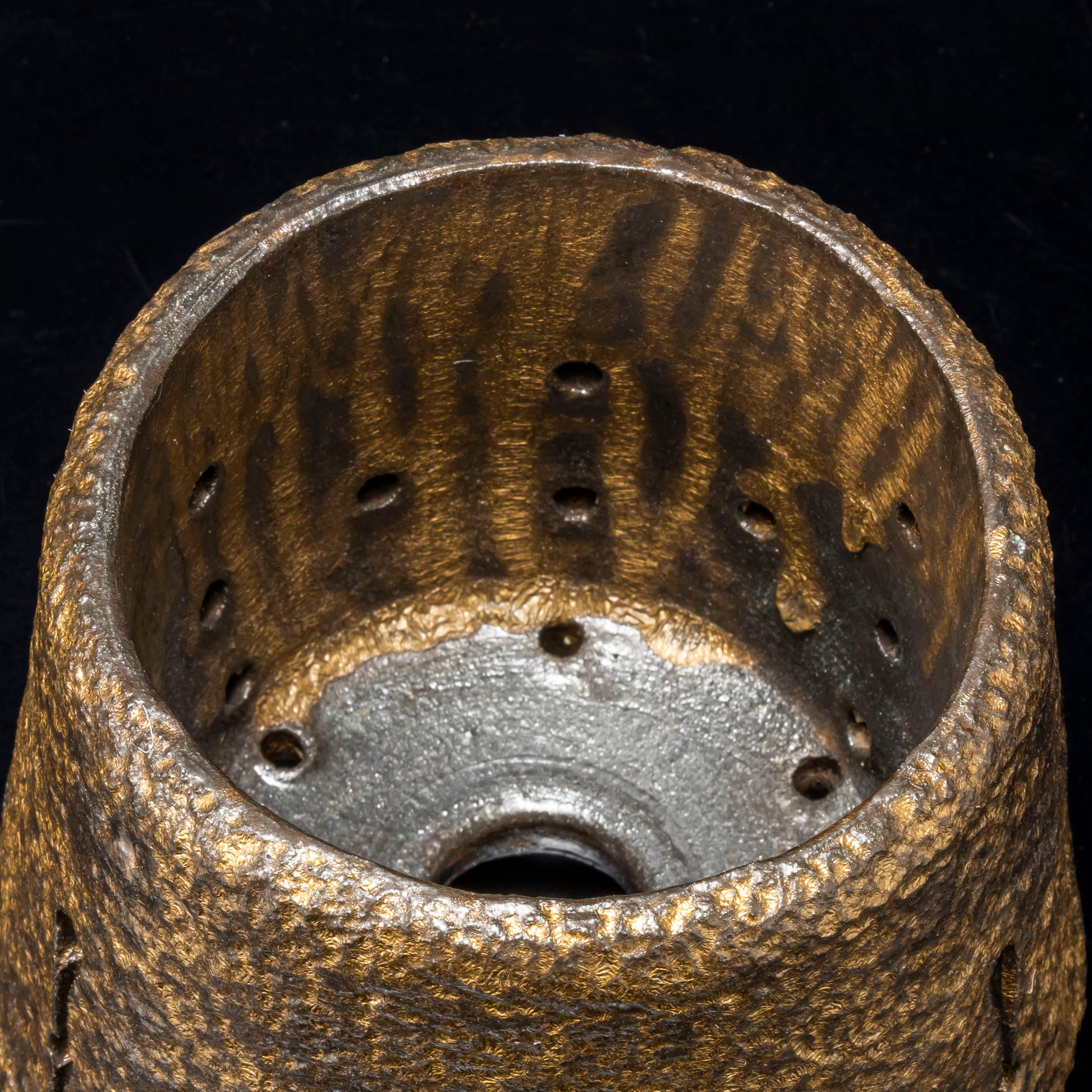 側面に穴をあけ、水みちを通し根腐れのしにくい工夫を施した植木鉢です。表面を御影石の破片で押して割れ肌を表現しています。釉薬を変える事で色味に変化をもたらしています。安定感のある三点の足は角度を変える事で違う表情が楽しめます。国際特許取得済みの作品です。