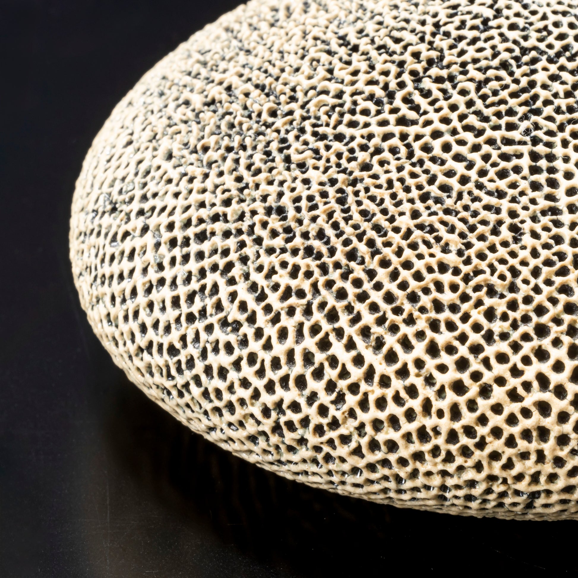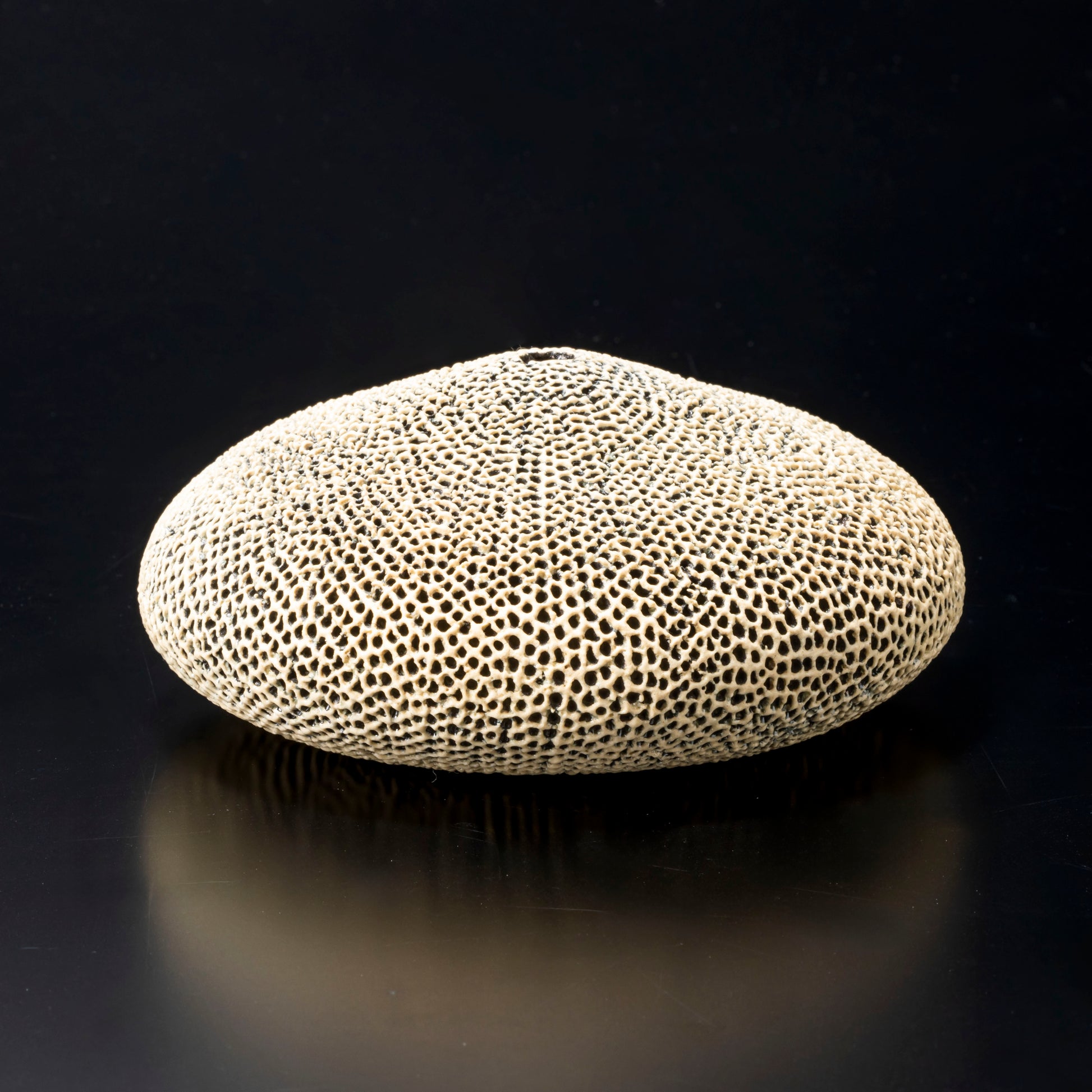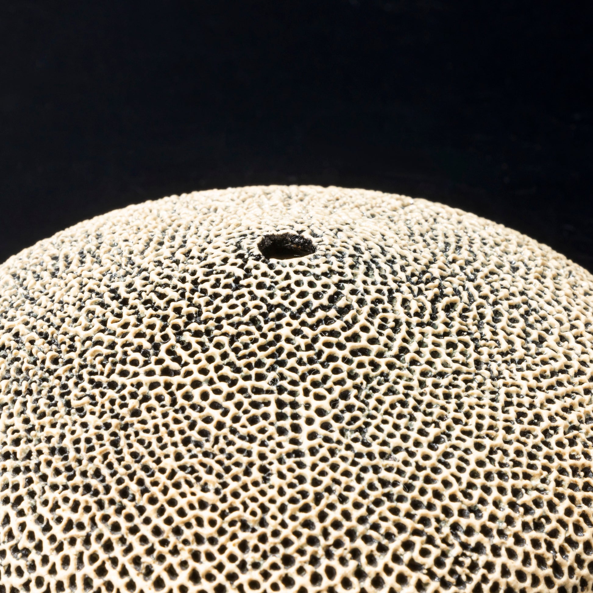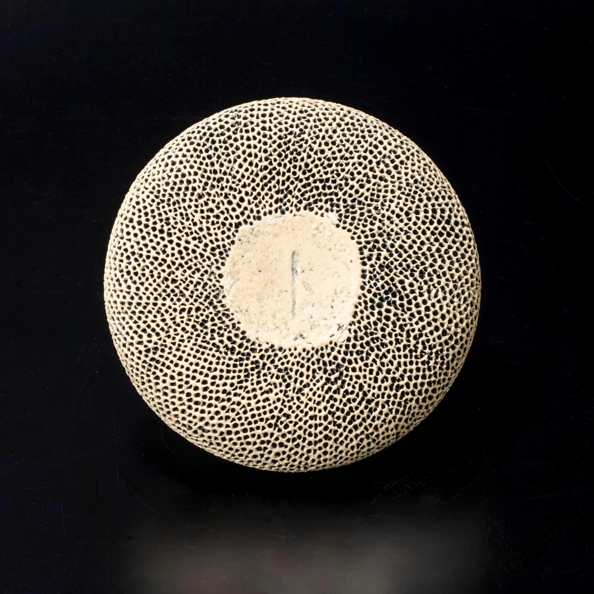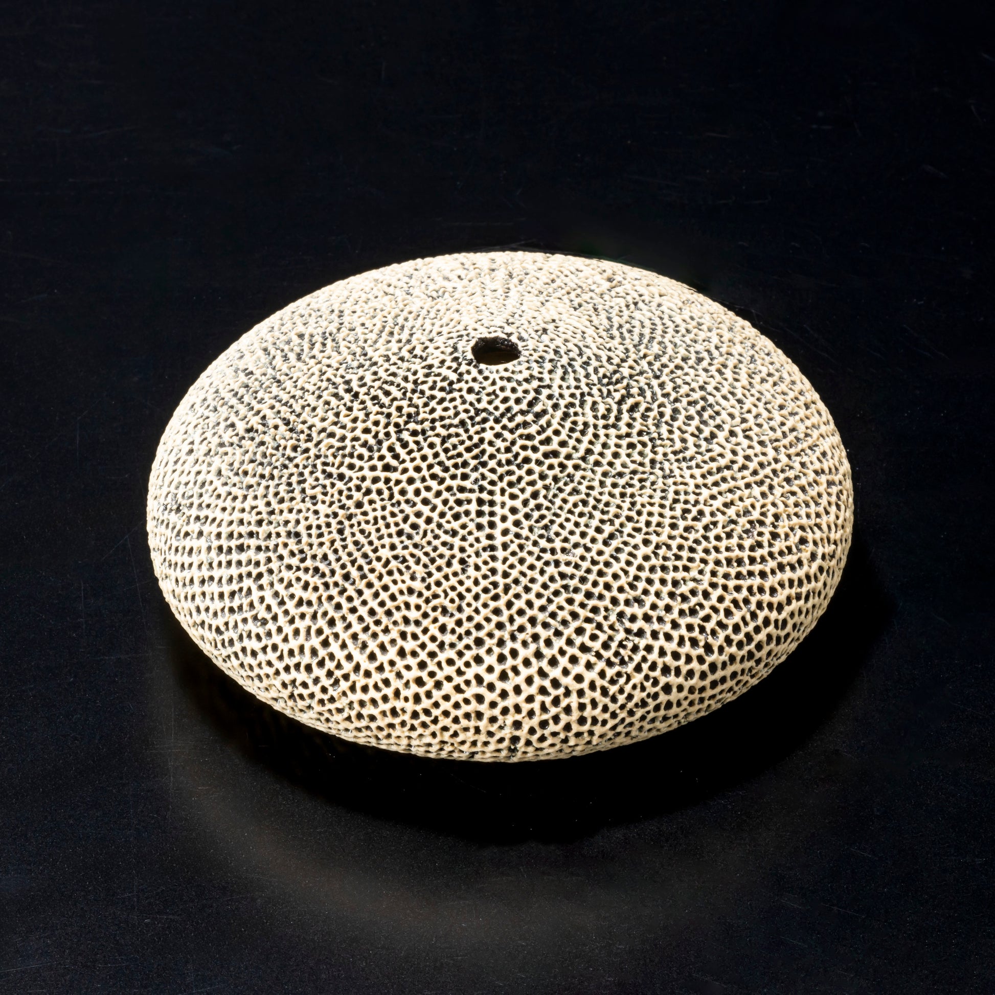 円盤型の形態で、中心部を隆起させ、その頂点に口を設けています。全面に天刻文を施した扁平な姿は、小振りでありながら落ち着きを感じさせます。