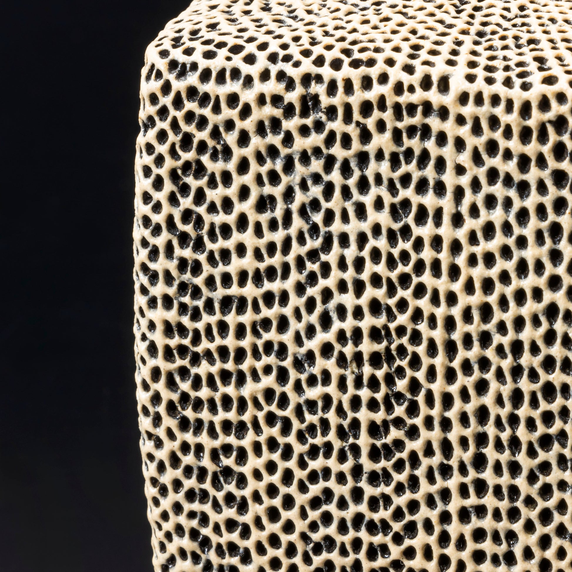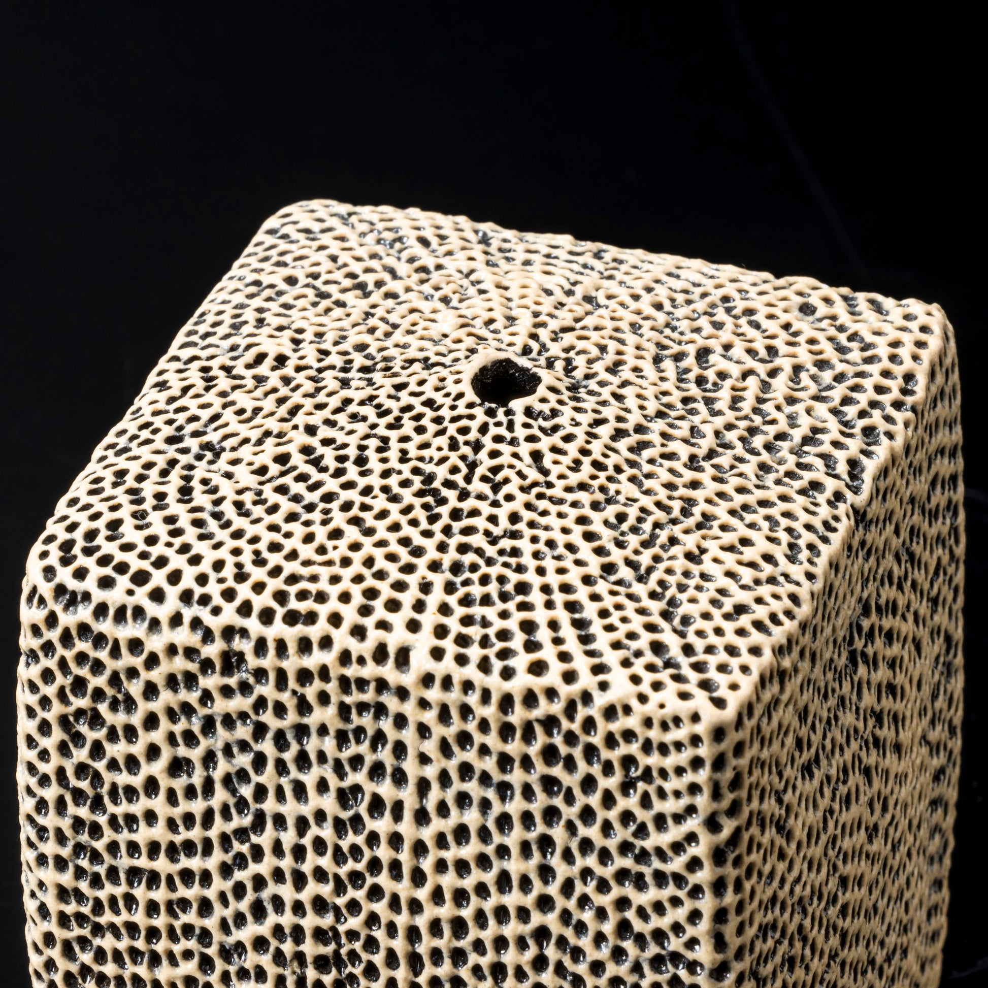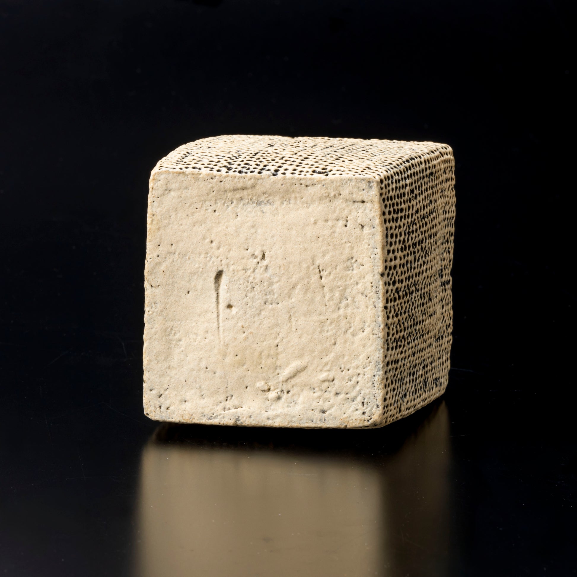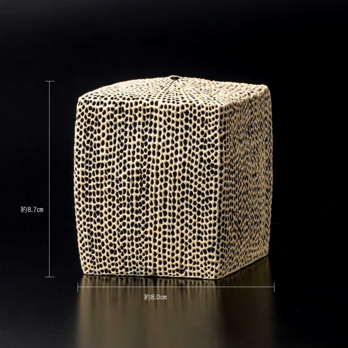 立方体の器の全面に、天刻文を施しています。方形の稜線の直線が、天刻文の文様を切り分けます。鋭角の頂点と相まって心地よい緊張感を伝えます。