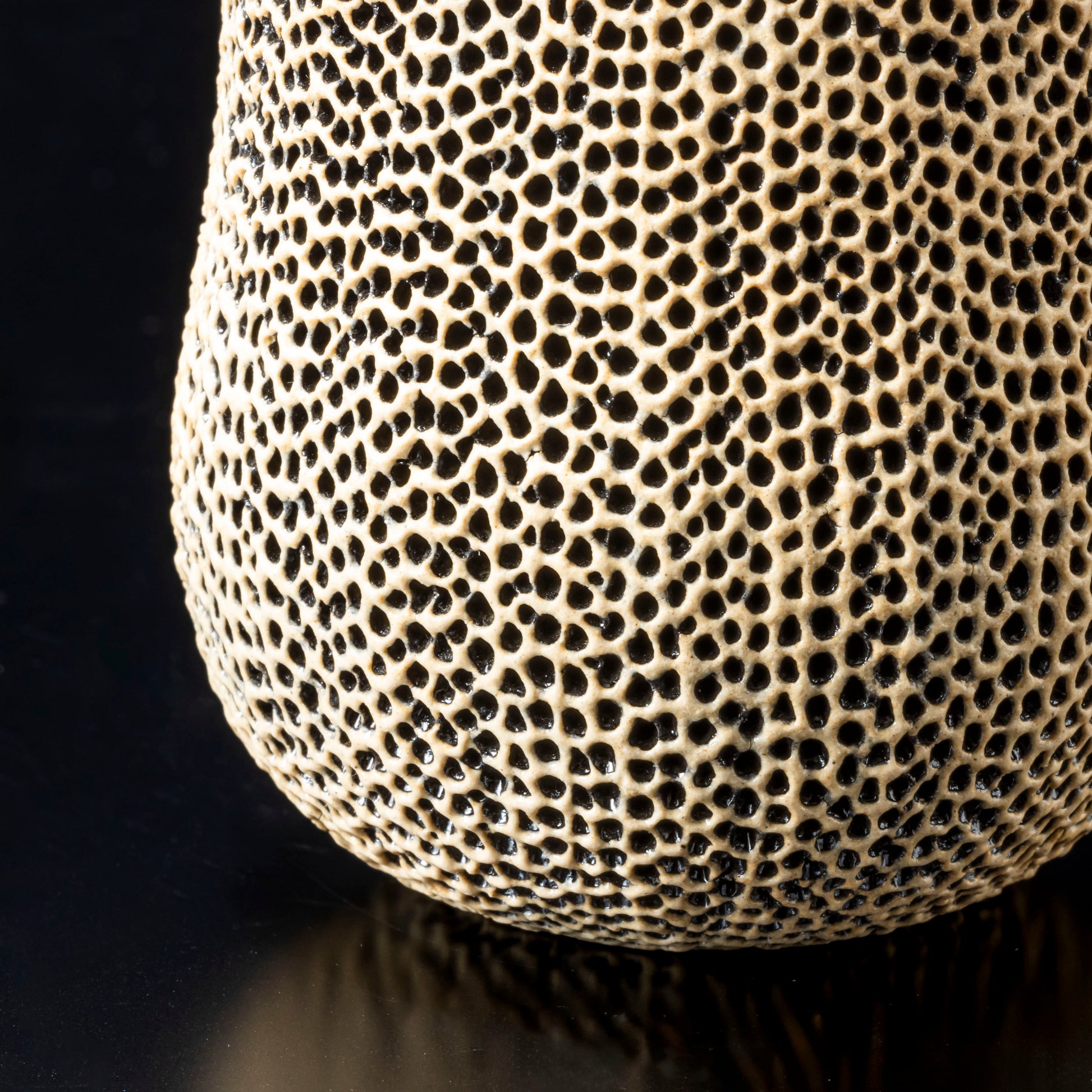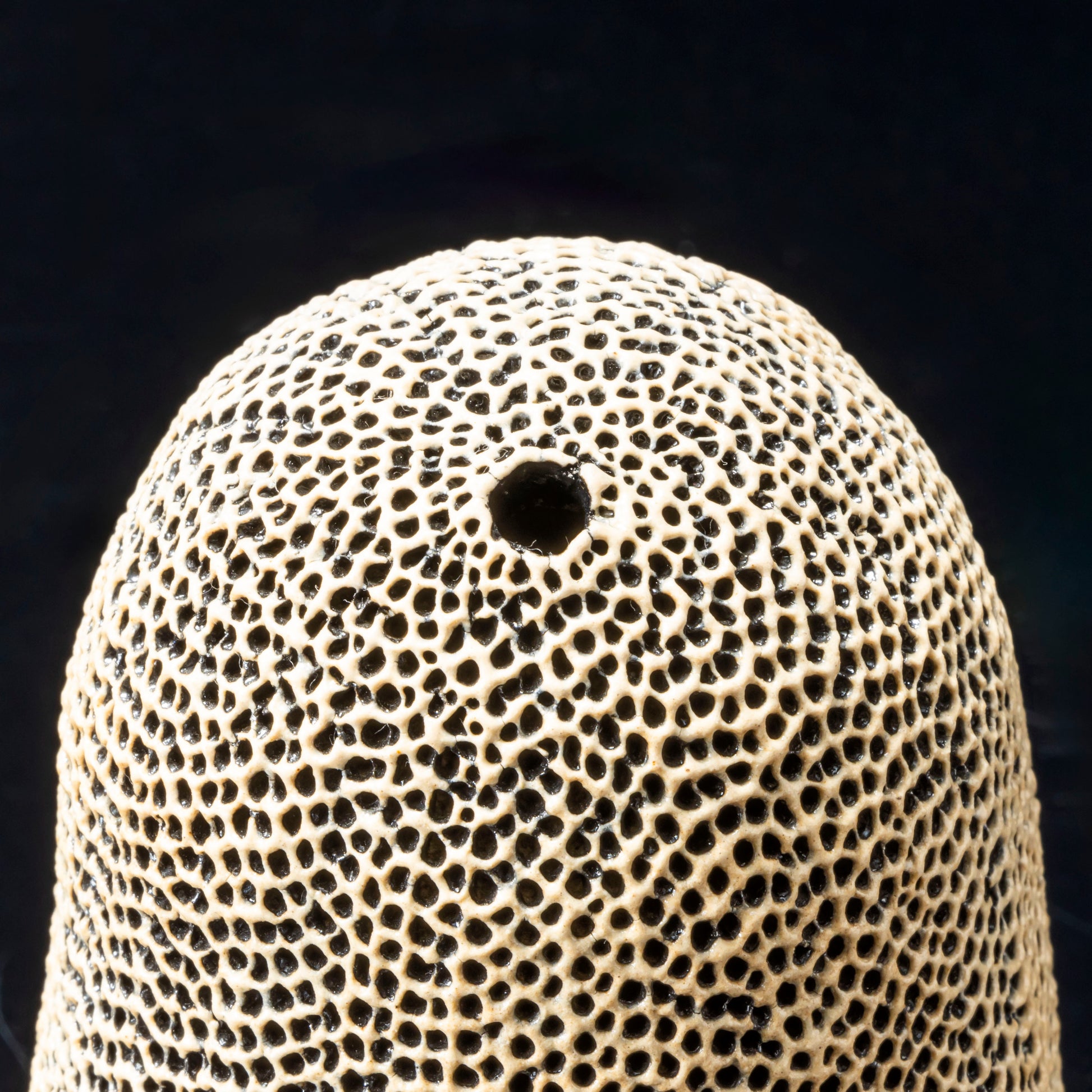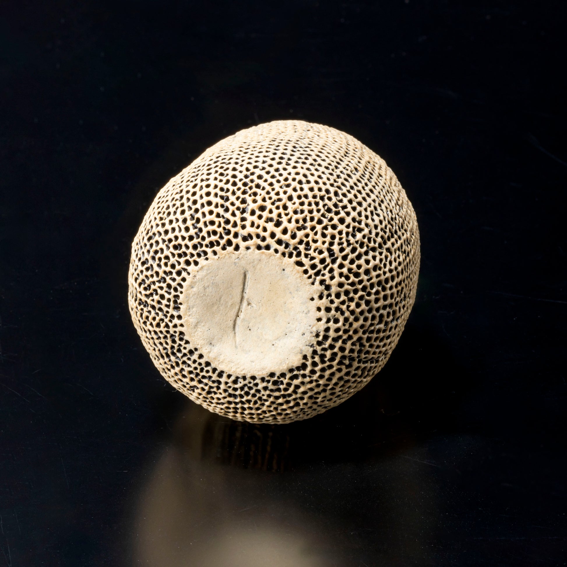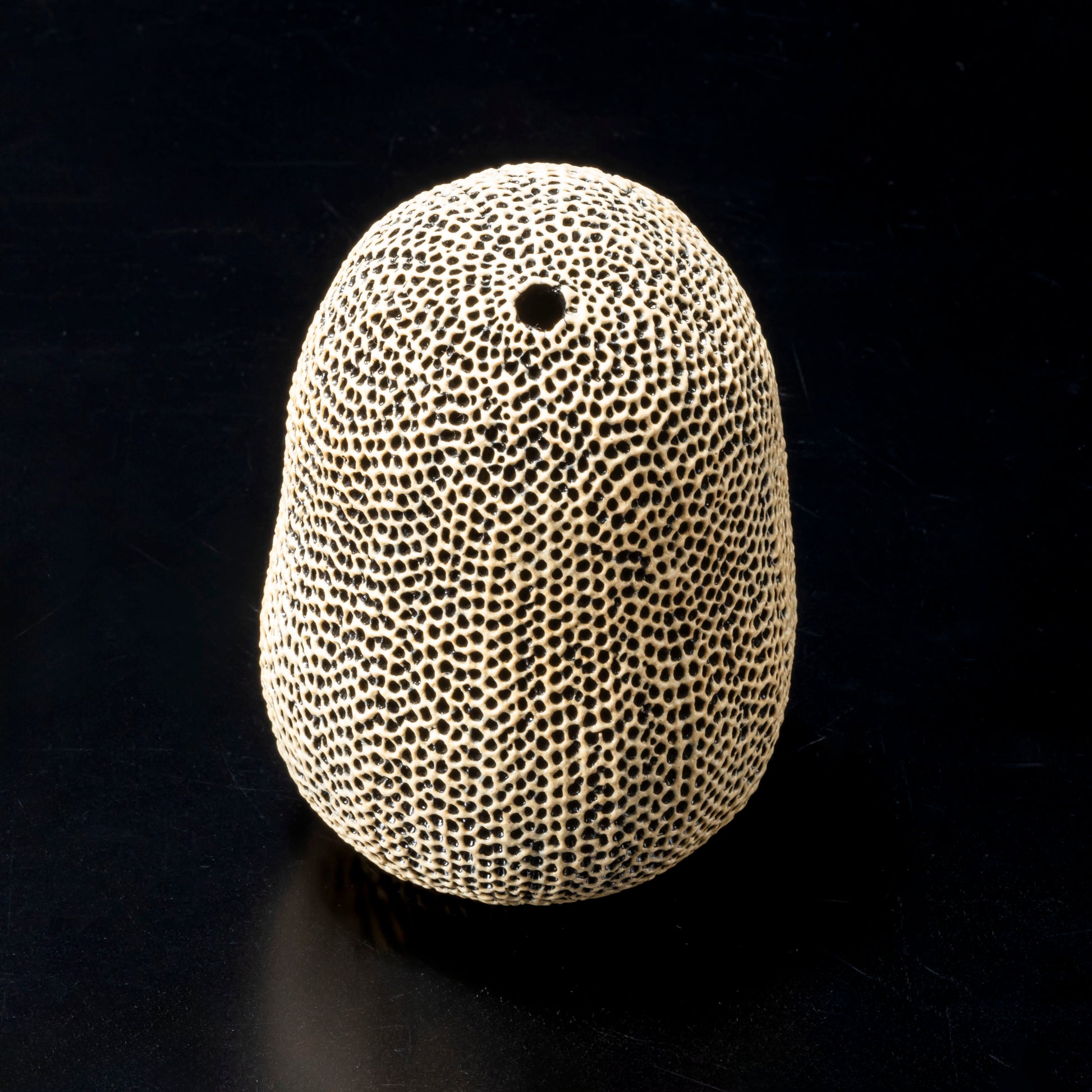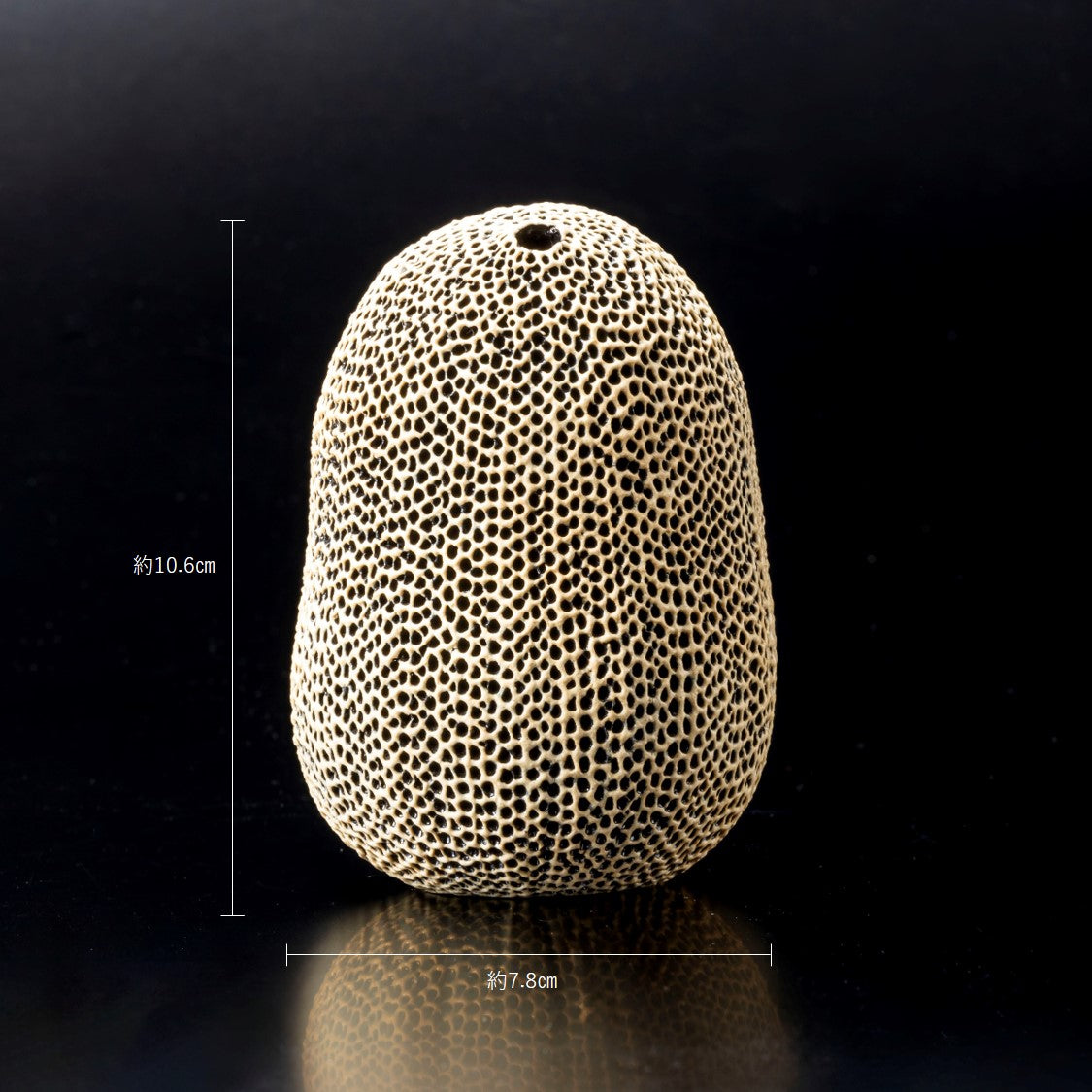 豆粒を彷彿させる形状に、小首を傾げるように斜め上部に口を付けています。滑稽味のある姿に緻密な天刻文を全面に施しています。