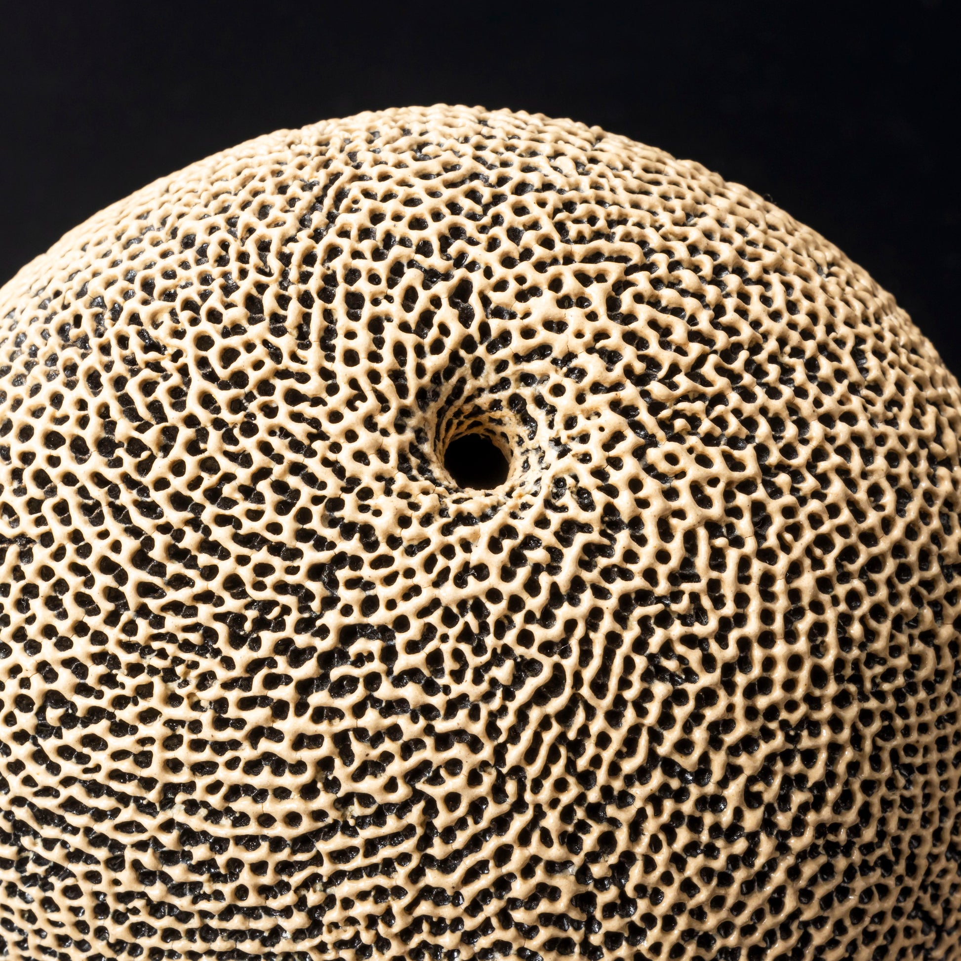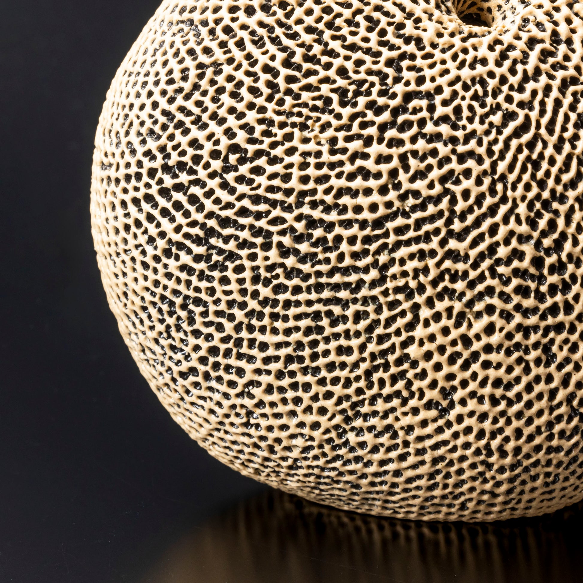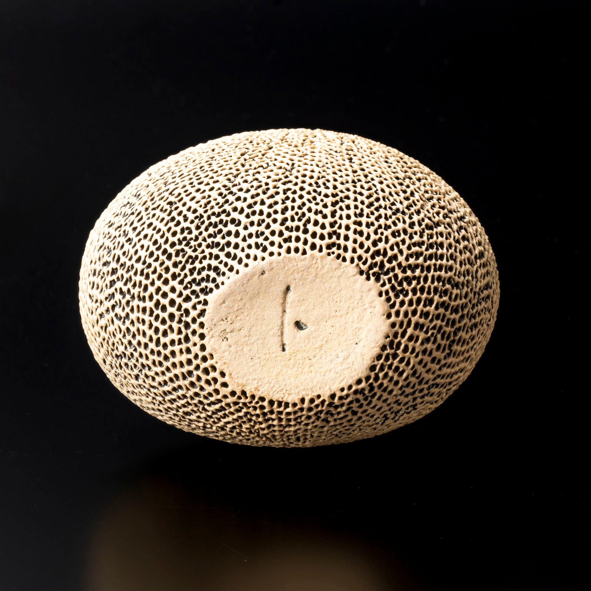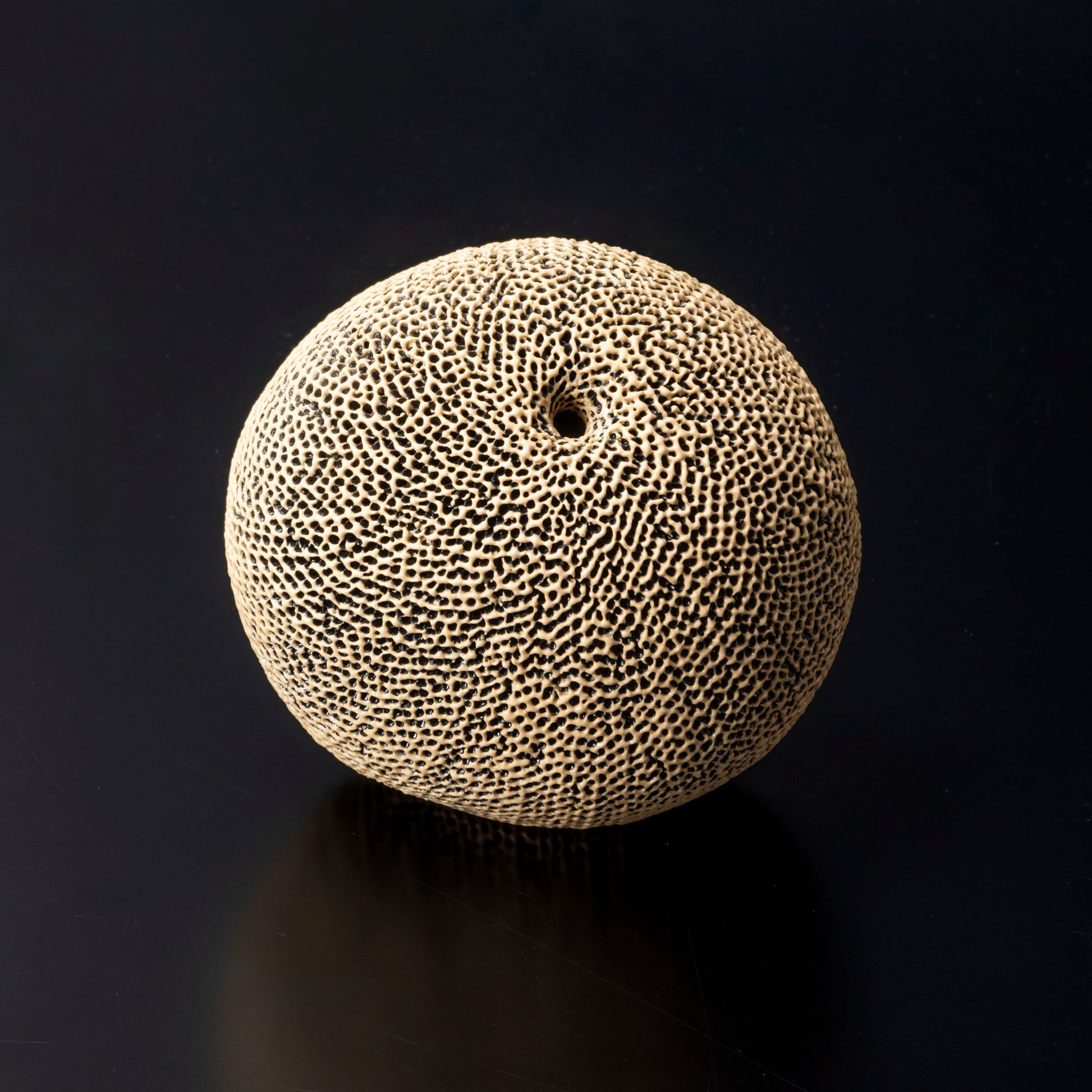 作品の全面を天刻文で覆い、口を頂点を外した斜め上方につけることで変化をつけ、見どころとしています。穏やかで柔和な姿は、心を落ち着かせます。正面を変える事でさまざまな表情が楽しめます。