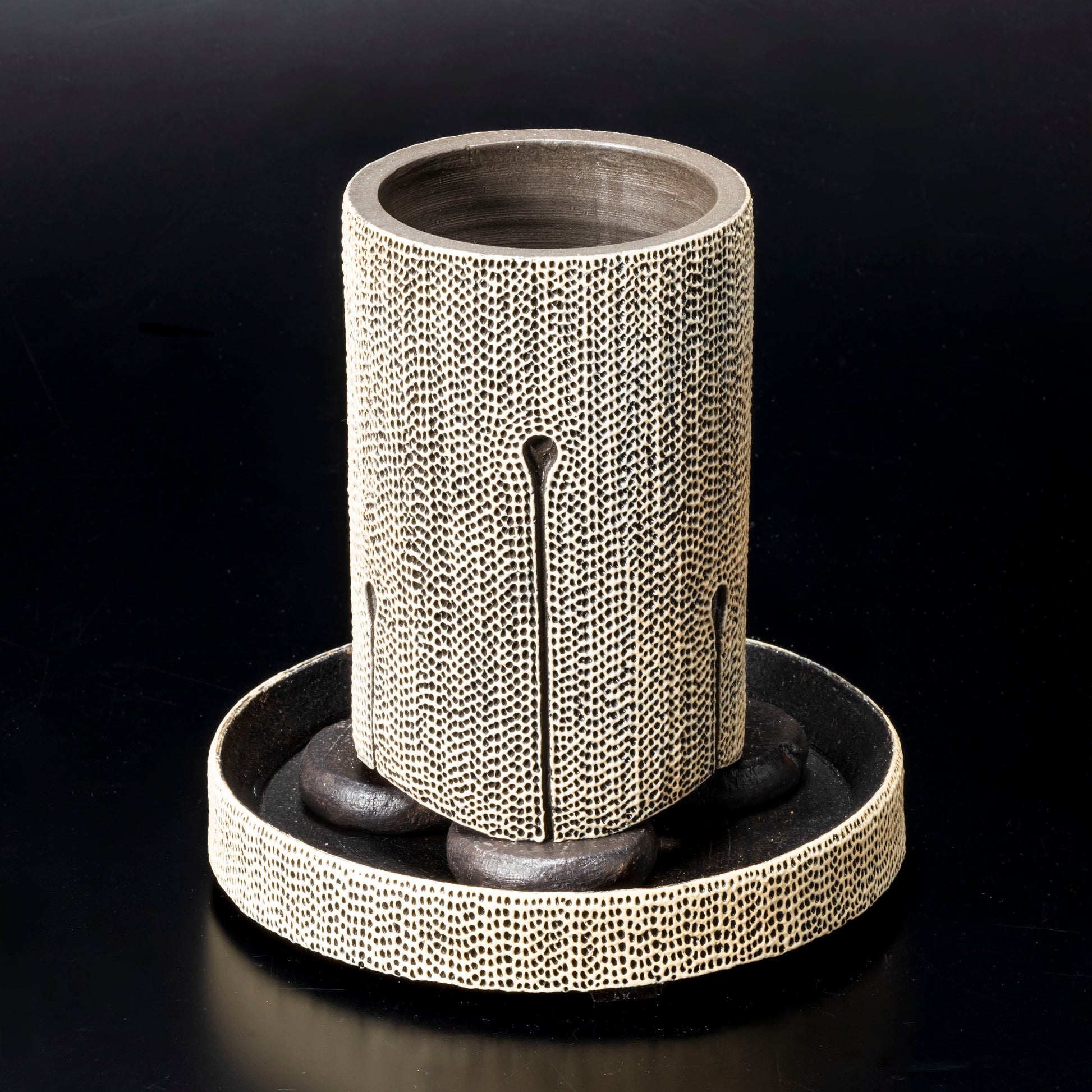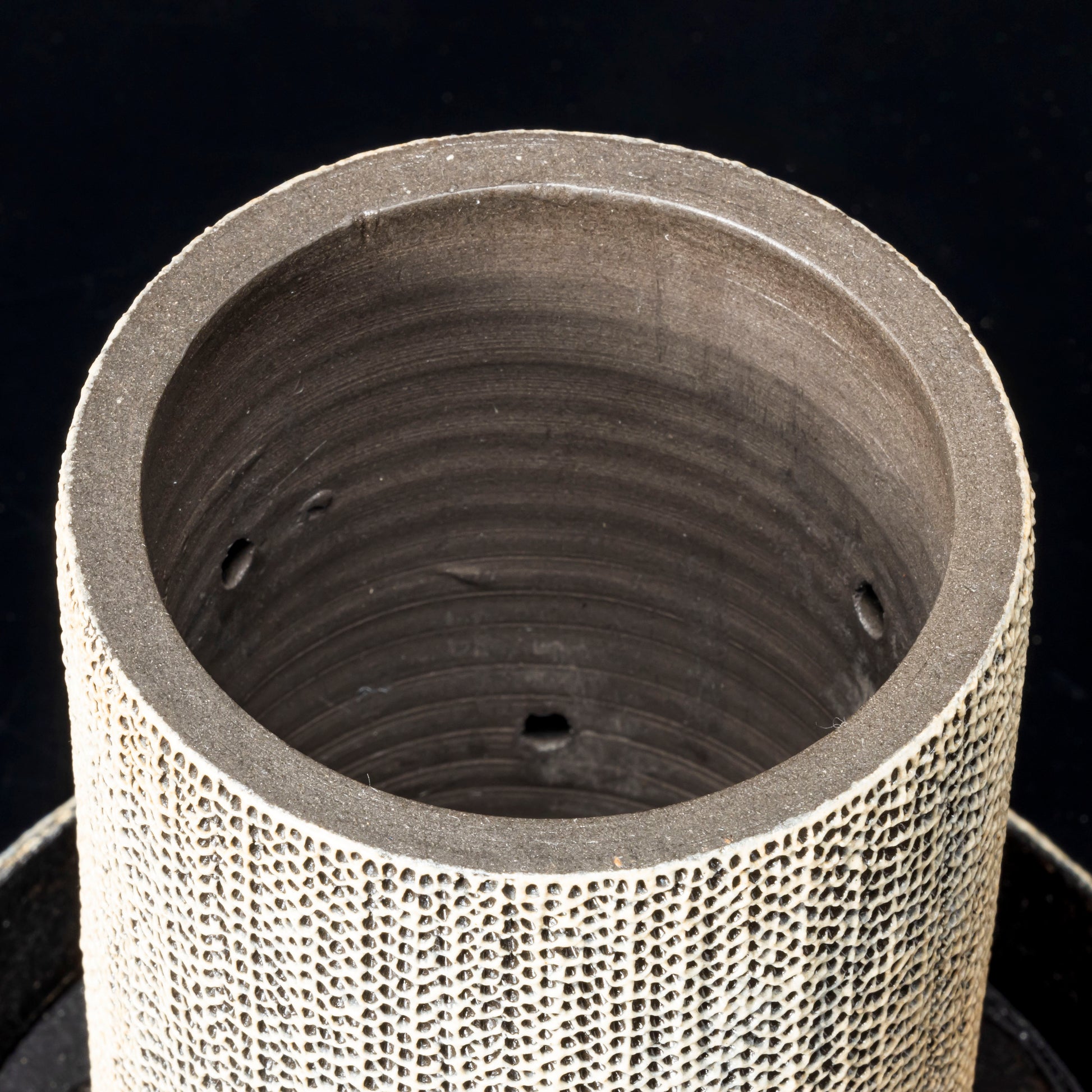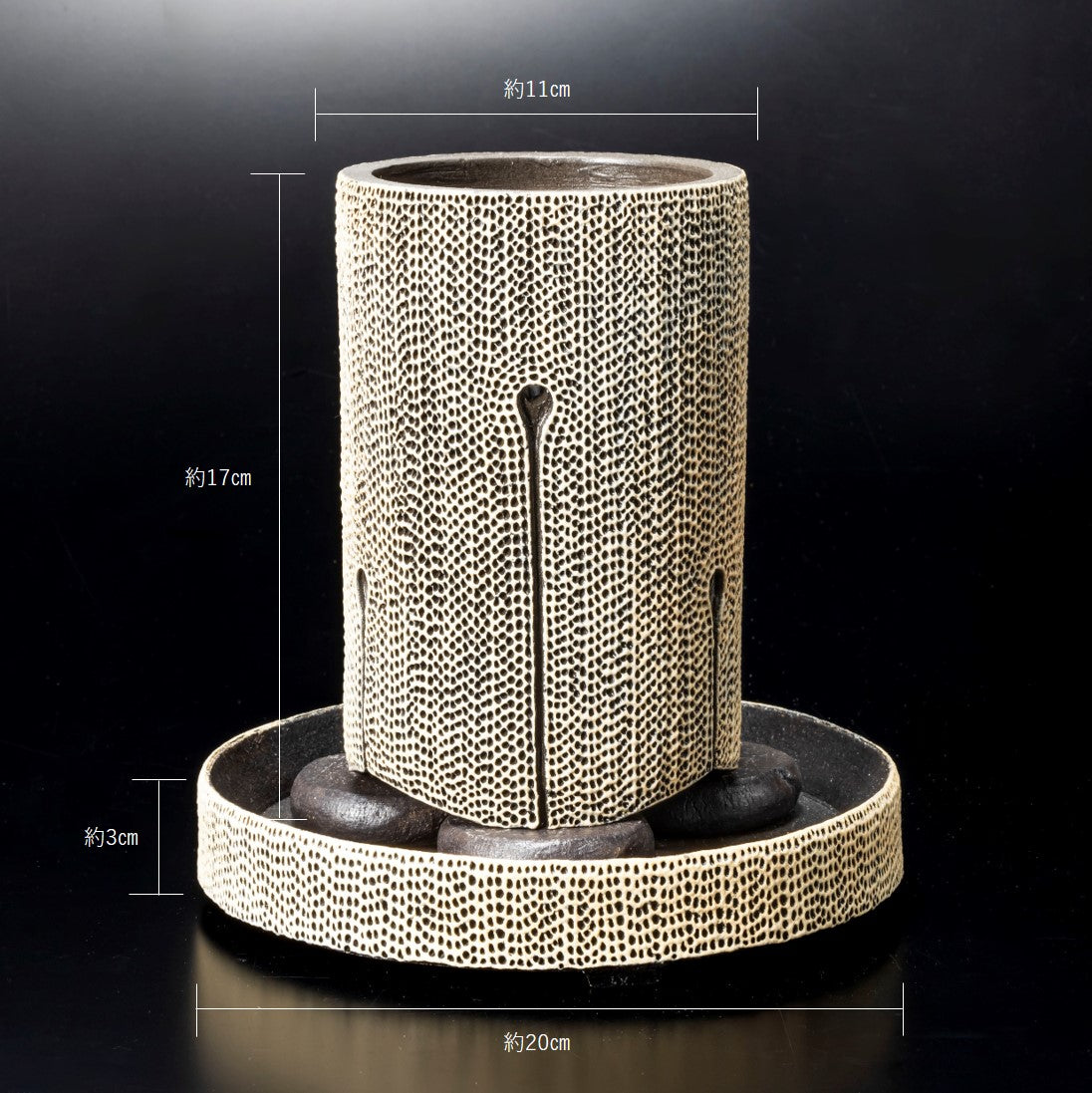 側面に穴をあけ、水みちを通し根腐れのしにくい工夫を施した植木鉢です。足の長い植物に合わせた形状になっています。作品全体に施された天刻文が深みのある温かさを感じさせます。国際特許取得済みの作品です。
