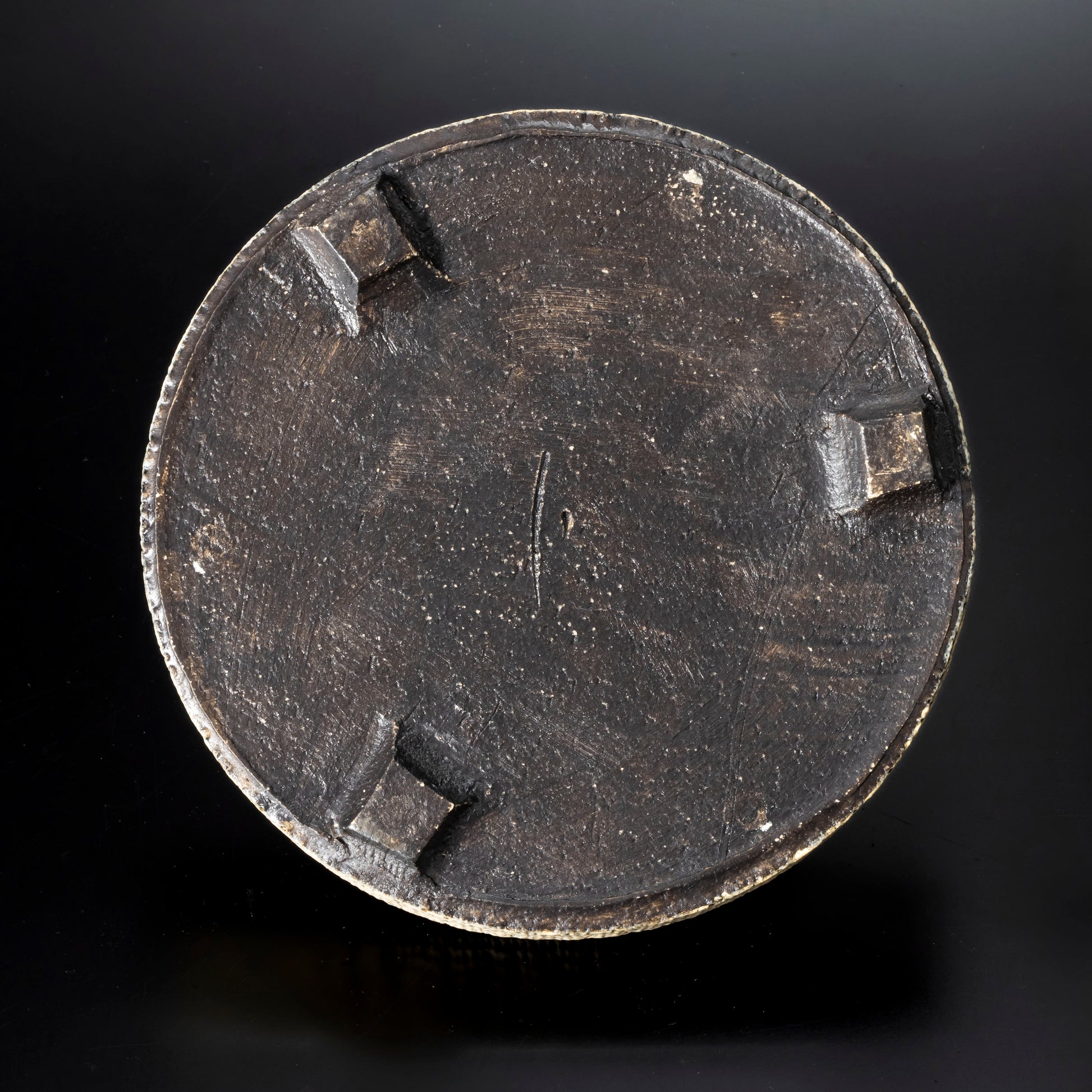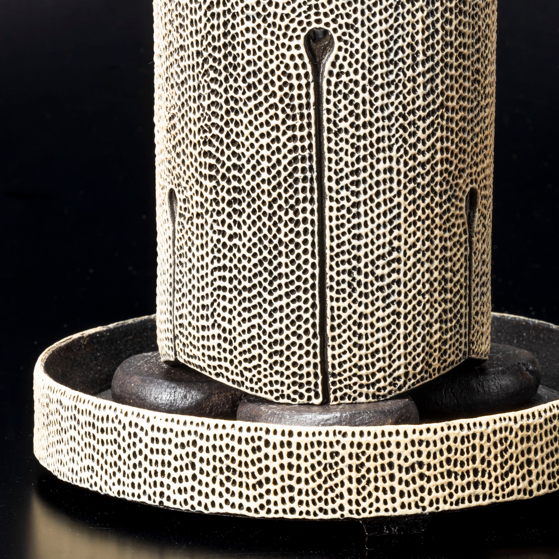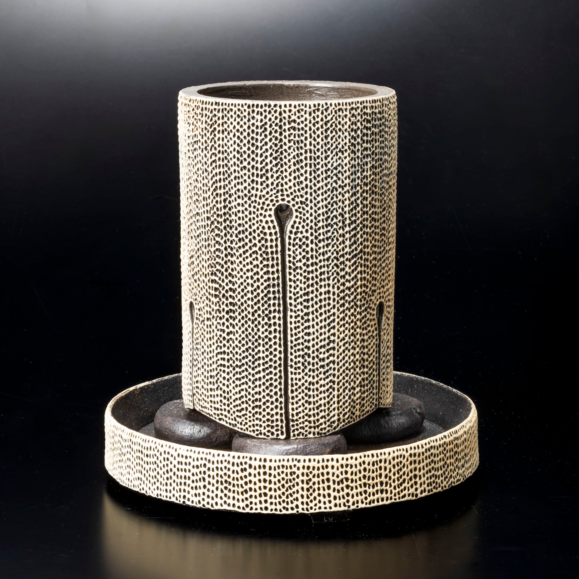 側面に穴をあけ、水みちを通し根腐れのしにくい工夫を施した植木鉢です。足の長い植物に合わせた形状になっています。作品全体に施された天刻文が深みのある温かさを感じさせます。国際特許取得済みの作品です。